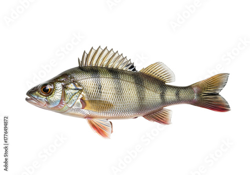 © Le MK, Fototapeta premium Side View of Perch Fish with Striped Body and Spiny Dorsal Fin on White Background