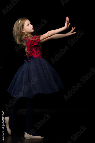 © lotosfoto, Naklejka premium Side View of Pretty Girl in Tutu Dress Holding Hands in front of