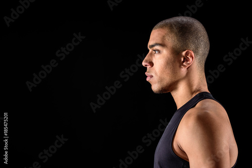 © LIGHTFIELD STUDIOS, Fototapeta premium side view of serious african american man standing isolated on black