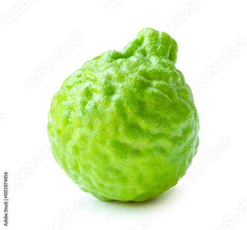 Obraz premium Side view of single fresh bergamot fruit or kaffir lime isolated on white...