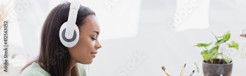 © LIGHTFIELD STUDIOS, Naklejka premium side view of smiling african american interior designer listening music in wireless headphones, banner