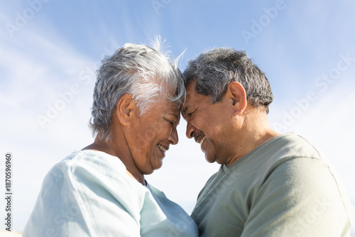 Fototapeta premium Side view of smiling senior multiracial couple touching forehead at beach...