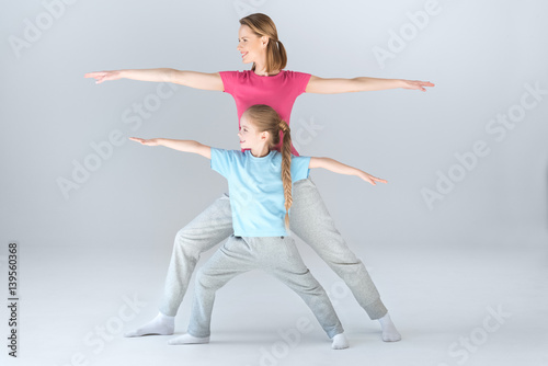 Fototapeta premium Side view of sporty mother and daughter practicing warrior yoga pose together...