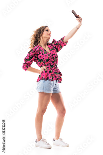 © sharplaninac, Fototapeta premium Side view of stylish fashionable young curly hair woman taking selfie with hand on hip. Full body isolated on white background.