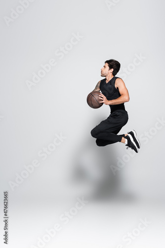 Fototapeta premium Side view of tattooed sportsman with basketball ball jumping on grey background
