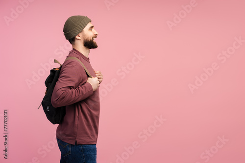 Fototapeta premium Side view of the smiling student with backpack looking away isolated