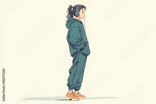© Robin, Fototapeta premium Side view of trap boy in tracksuit walking with hands in her pockets and listening music