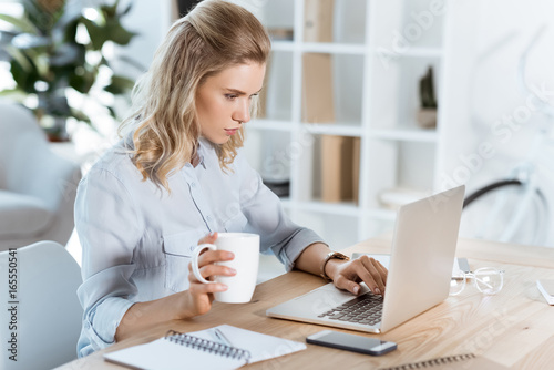 Fototapeta premium side view of young businesswoman with cup of coffee in hand typing on laptop...