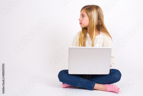 © Jihan, Fototapeta premium Side view of young happy smiling caucasian teen girl sitting with laptop in lotus position on white background