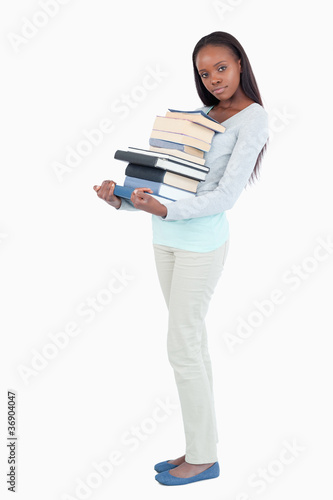 Fototapeta premium Side view of young woman with a pile of books