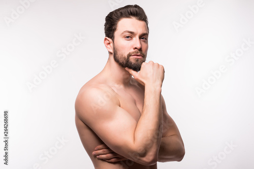 Fototapeta premium Side view portrait of a young man with nude torso over white background
