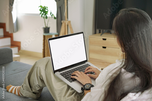 © kenchiro168, Fototapeta premium Side View shot of young business woman working with mockup white screen laptop computer in living room at her home. Working at home concept