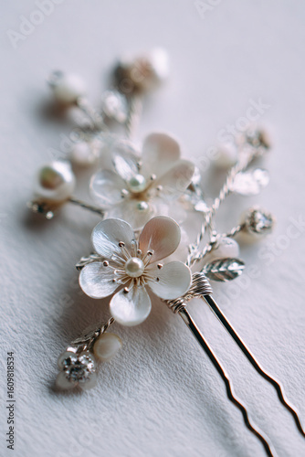 © Duy, Fototapeta premium Sideview of a silver hairpin with cherry blossom motifs