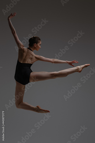 © Fxquadro, Fototapeta premium Sideview shot of jumping ballerina against gray background