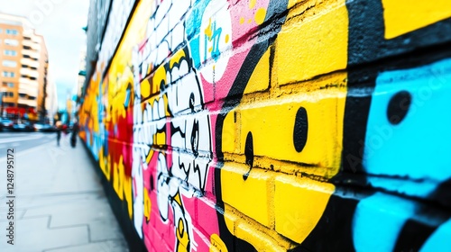 © jitthanant, Naklejka premium Sidewalk bordered by a graffiticovered wall, urban street art culture, edgy and vibrant atmosphere, creative city expression
