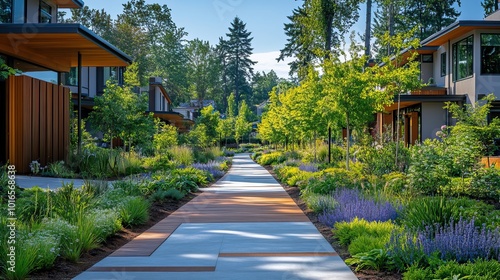 © Feeney, Fototapeta premium sidewalk lined,thriving plants and trees in a sustainable urban setting promoting eco friendly living and pedestrian health through a well designed walkway.create by F.a