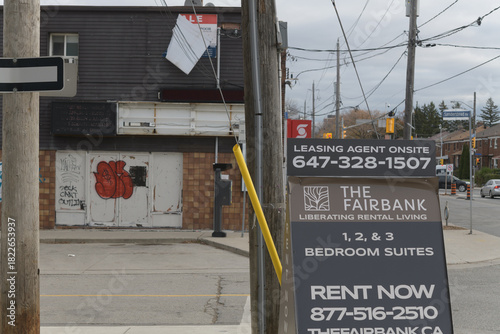 Fototapeta premium sidewalk sign near The Fairbank, an apartment complex, located at 9 Croham Rd, Toronto (photo: looking east on Eglinton Av W)