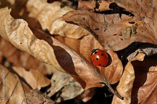 Naklejka premium Siebenpunkt-Marienkäfer (Coccinella septempunctata) auf Herbstlaub