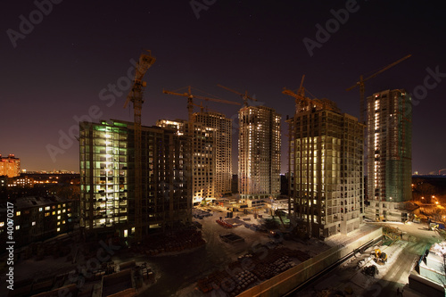 © Pavel Losevsky, Fototapeta premium Siedem wysokich budynków w budowie z dźwigami