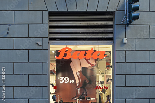 © annavee, Naklejka premium SIENA, ITALY – OCTOBER 7, 2025: Bata shop window with orange logo and brown ankle boots for sale. The footwear and fashion accessories brand is headquartered in Lausanne, Switserland