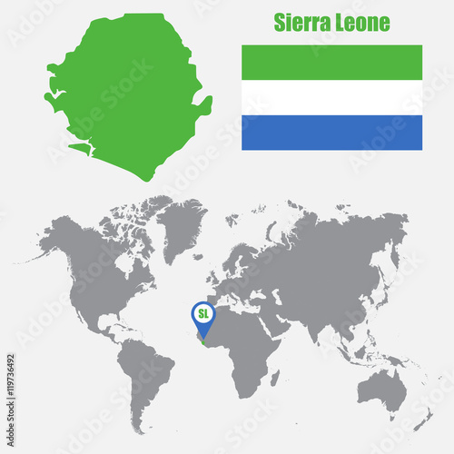 © stas111, Obraz premium Sierra Leone map on a world map with flag and map pointer. Vector illustration