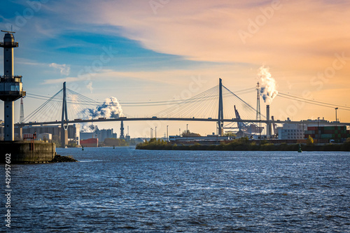 Fototapeta premium sight over port of hamburg industrial area with hamburgs most famous suspension bridge called Kohlbrand bridge, crossing the elbe river during dusk