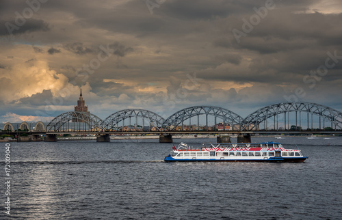 Fototapeta premium Sightseeing cruise boat on the river Daugava in Latvian capital Riga. Railway...
