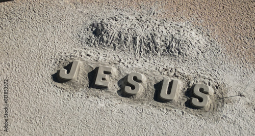 Fototapeta premium Sign displaying the name "Jesus" in the sand