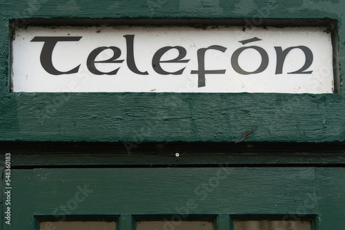 Obraz premium Sign in Irish language phone on an old phone booth.