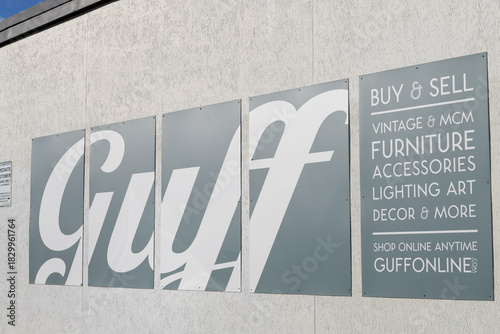 Fototapeta premium sign outside GUFF, a furniture store, located at 1 Davies Av off Queen St E, Toronto