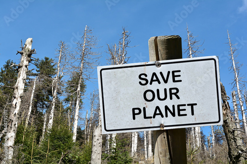 © Heiko , Fototapeta premium Sign with the inscription Save our Planet. In the background a dead forest in Germany