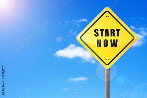 © borisshevchuk, Naklejka premium Signpost start now on sky background.