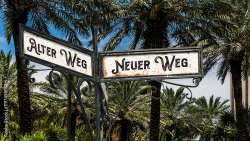 © Thomas Reimer, Fototapeta premium Signposts the direct way to New Path versus Old Path