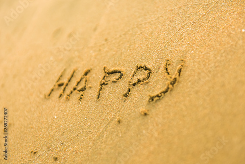 © Антон Зимин, Fototapeta premium Signs on sand beach written by hand, inspire to travel to exotic islands and relax. Words Ocean, fun, happy and smile on yellow beach. Family tour travel time in summer resort. Enjoy your holidays