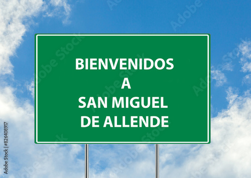 Obraz premium Siguiente salida Bienvenidos a san miguel de allende una señal verde sobre...
