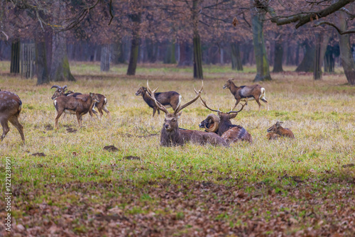 © Roman Bjuty, Naklejka premium Sika deer - Cervus nippon, doe and mouflon in meadow and forest. Photo from wild nature