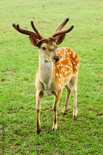 © sergign, Fototapeta premium Sika deer on the background of green grass.