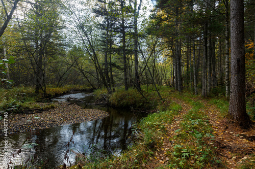 © alexhitrov, Obraz premium Sikhote-Alin Biosphere Reserve. Far Eastern autumn taiga. Ecological hiking trail in a dense autumn forest.