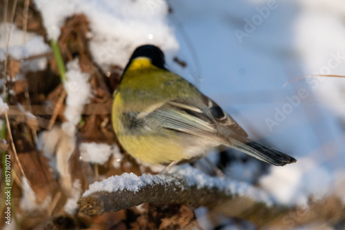 Obraz premium sikorka bogatka wśród ośnieżonych gałęzi znajduje nasiona do zjedzenia