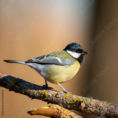 © Adrian, Fototapeta premium Sikorka na zółtym tle bokeh