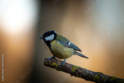 © Adrian, Fototapeta premium Sikorka portret bokeh zółte tło na gałązce