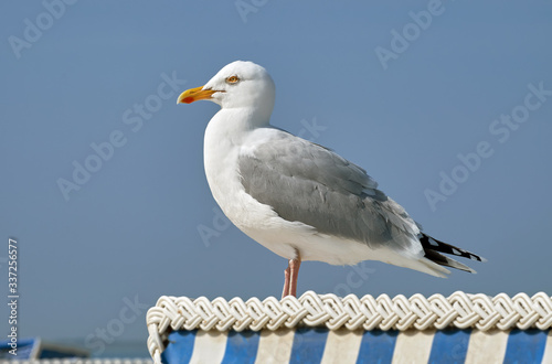 © kranidi, Obraz premium Silbermöwe auf einem Strandkorb.
