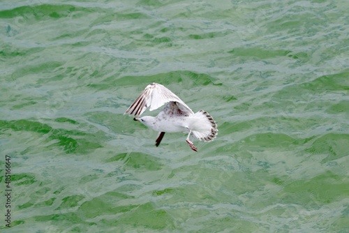 © Peter, Fototapeta premium Silbermöwe über grünem Wasser