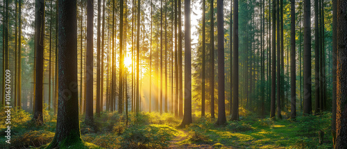 Obraz premium Silent Forest in spring with beautiful bright sun rays