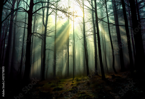 © Stewart Bruce, Naklejka premium Silent Forest in spring with beautiful bright sun rays