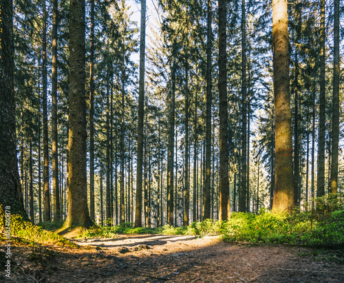 Obraz premium Silent Forest in spring with beautiful bright sun rays