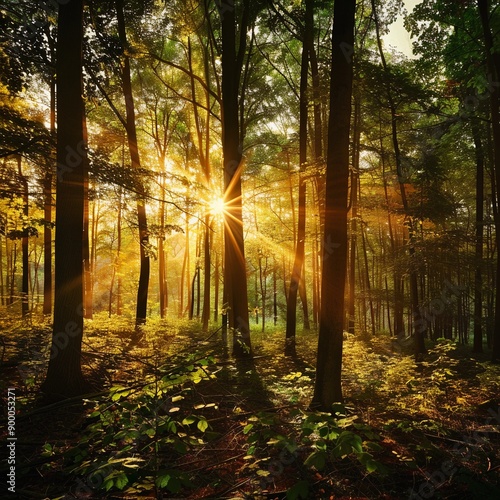 © Hesti, Fototapeta premium Silent Forest in spring with beautiful bright sun rays.