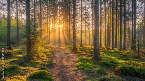Obraz premium Silent Forest in spring with beautiful bright sun rays