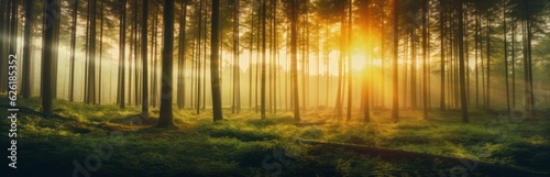 © Neural Pixels, Obraz premium Silent Forest in spring with beautiful bright sun rays. Generative AI