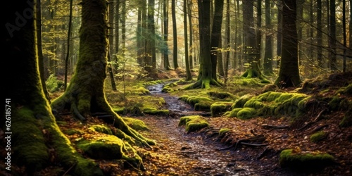 Obraz premium Silent Forest in spring with beautiful bright sun rays. Generative AI